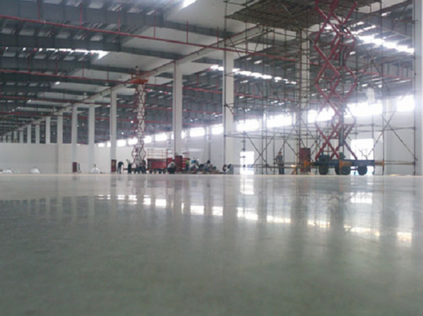 金刚砂硬化耐磨地坪适用于物流仓库、厂房车间、地下停车场、维修车间、机场跑道等要求高度耐用耐磨损的地面;产品特性:表面硬度高、密度大、耐磨、耐用、防尘、防油不易剥离、颜色及适用范围广等优点,同时在防滑性、搞冲击性和抗渗透性方面性能良好;施工程序:1.混凝土浇筑、2.边角加固抹平、3.计划覆盖率、4.第一次撒布材料、5.机械抹平、6.第2次撒布材料、7.机械抹平、8.机械收光。